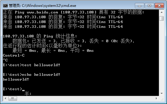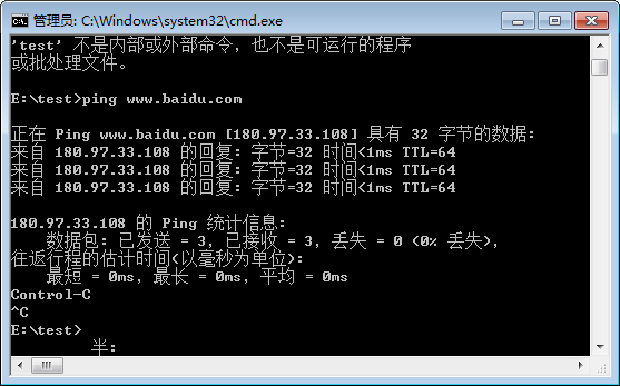 这是因为命令行自带一部分内部命令,并且提供外部命令执行某些操作,同时命令行也会在当前目录搜索可运行的程序或者批处理文件来执行,而我执行的test都不满足以前情况,所以报错,但如果我执行ping http://www.baidu.com,则可以正确运行,因为ping是一个外部命令。
