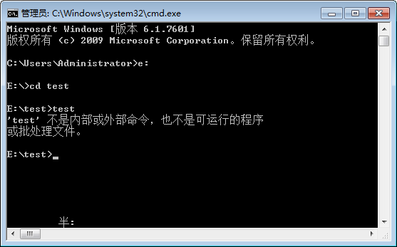 然后输入test,会提示‘test’ 不是内部或外部命令,也不是可运行程序或批处理文件